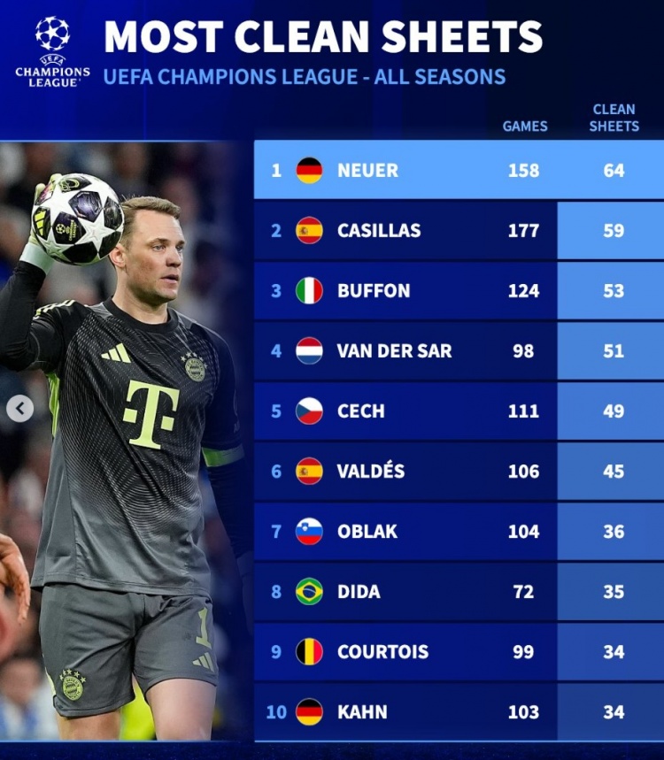 世界杯投注-欧冠历史零封榜:诺伊尔居首,卡西、布冯、范德萨、切赫列前五